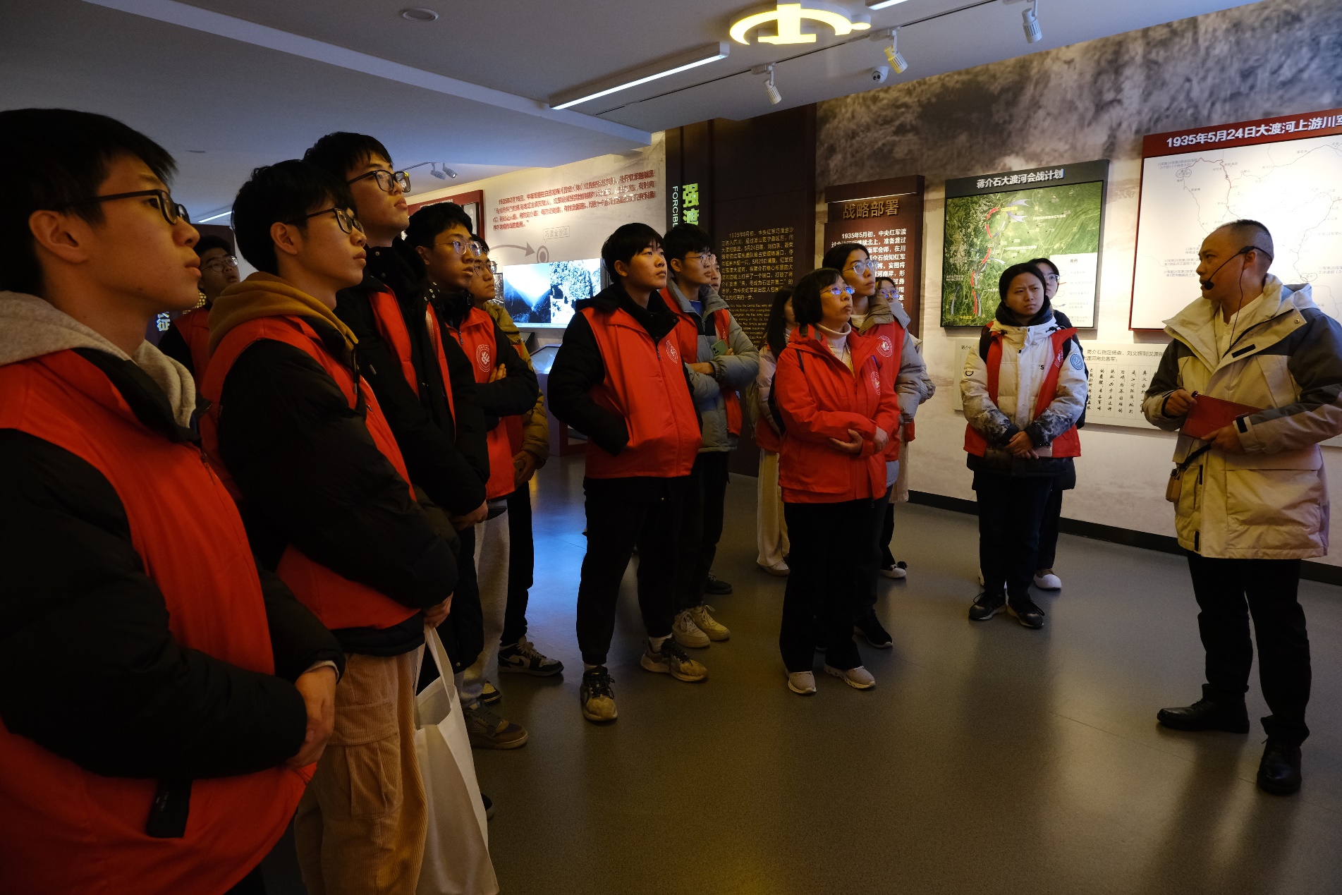 1月16日上午,卓工班师生前往中国工农红军强渡大渡河纪念馆参观学习。“没有强渡大渡河的胜利,就没有中国工农红军长征的胜利,就没有今天的新中国”,1935年5月,中国工农红军胜利强渡大渡河,创造了战争史上的奇迹。纪念馆馆长向师生们详细讲解了自1934年10月红军苏区开始转移到1936年10月红军胜利会师的长征历史。同学们沉浸在“四渡赤水”的天才指挥,“彝海结盟”的民族深情,“强渡大渡河”的奇袭制胜,“飞夺泸定桥”的惊险悲壮等革命故事中,被17名勇士不怕牺牲、奋勇渡河的壮举,军民团结、同仇敌忾的气节,红军敢于战天斗地的大无畏革命精神深深触动。