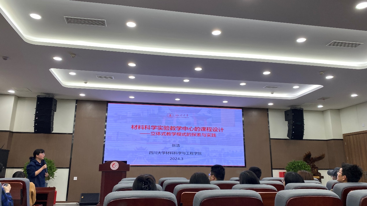 示范中心教师张洁老师以“材料科学实验教学中心的课程设计——立体式教学模式的探索与实践”为题,与大家分享了如何在教学过程中启发学生身临其境地思考实验解决方案的相关经验。