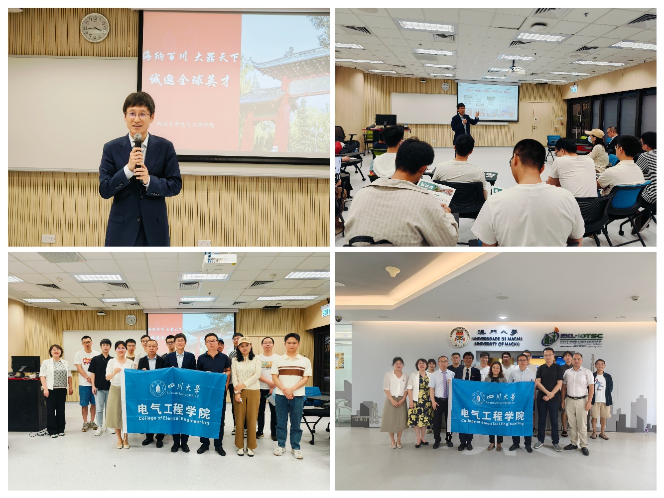 访问期间,学院分别在澳门大学和香港理工大学举行了人才专场推介会。赵昱辉书记从川大是一所怎样的大学、川大电气是一个怎样的学院、为什么选择来川大电气创业等方面,向与会青年人才介绍了学校和学院基本情况,诚邀广大青年才俊选择川大电气成就人生梦想。