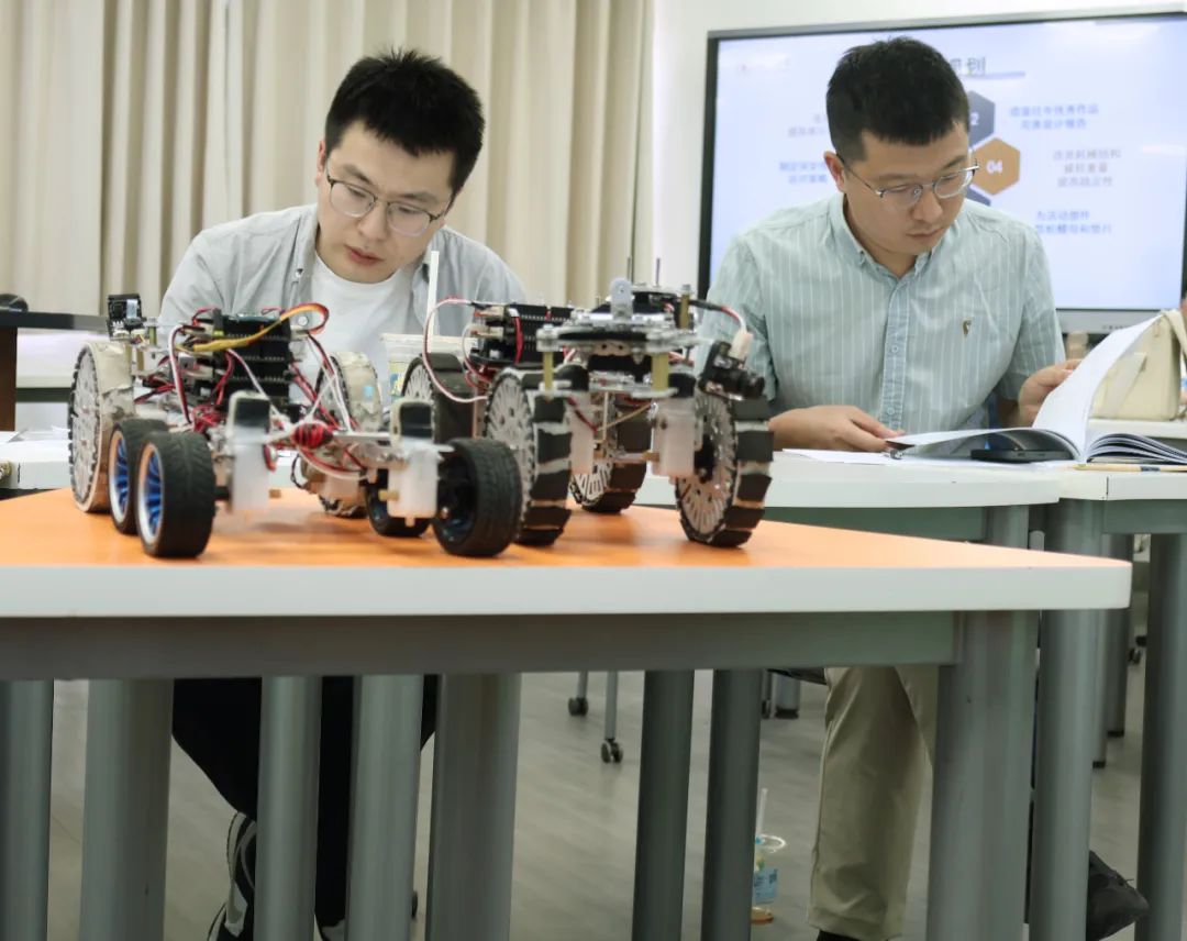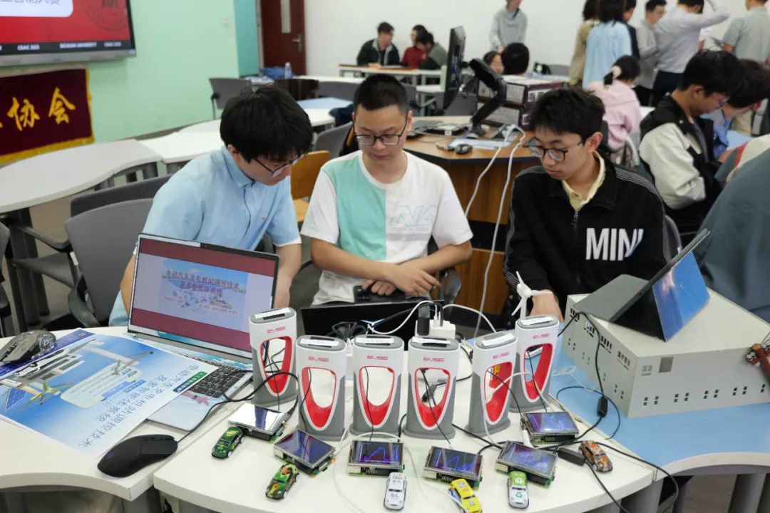 比赛当天上午为自主命题组比赛,展示方式为展位展示,每支队伍一个展位,专家依次到达每个队伍的展位前,学生进行讲解和答辩。参赛队伍运用机器人或人工智能技术,结合专业知识,提出了在自主循迹、电池退化诊断、遥控作业、电动汽车充电调控等场景下的软硬件创新方案。评委老师重点围绕完善创新思路、精准定位应用场景、强化原创性技术细节、突破作品同质化问题等方面与同学们进行了分析交流,使同学们受益匪浅。比赛现场学术氛围浓厚,专家评委与各参赛团队展开了深入的技术交流与思维碰撞,多支队伍凭借优秀的硬件作品和智能交互软件引发关注,现场气氛热烈。