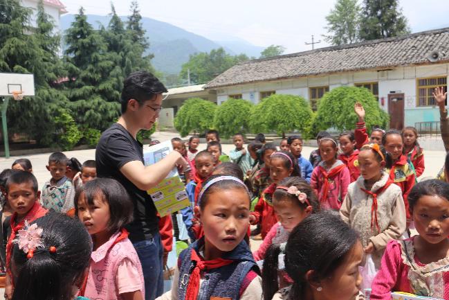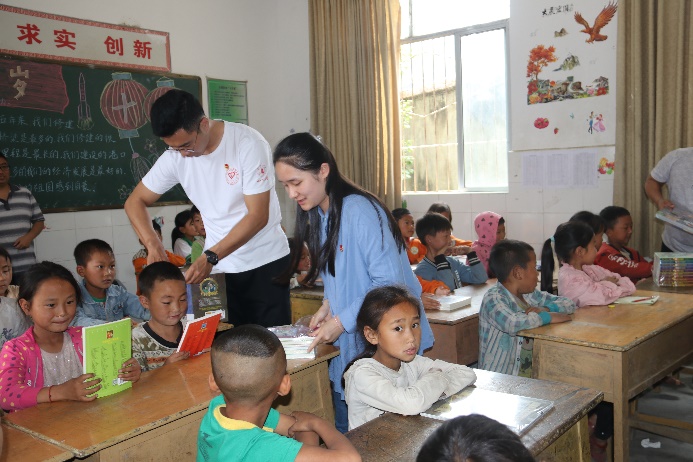爱心志愿者在甘洛县石海乡吉加小学校为孩子们发放图书