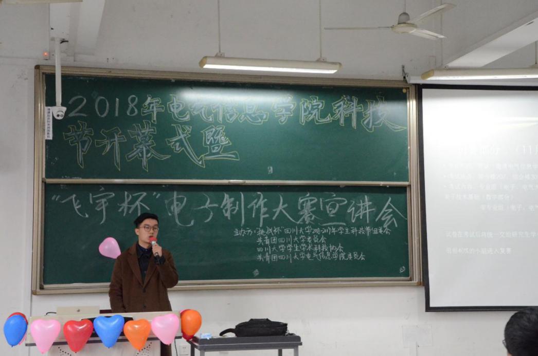 11月17日,电气信息学院科技节开幕式暨“飞宇杯”电子制作大赛宣讲会在江安校区综合楼C座207教室成功举办。电气信息学院党委副书记戴婷婷老师,教导员李小根老师,团委副书记汤博老师,2018级辅导员、分科协辅导老师卜涛老师以及各参赛组员参加本次活动。