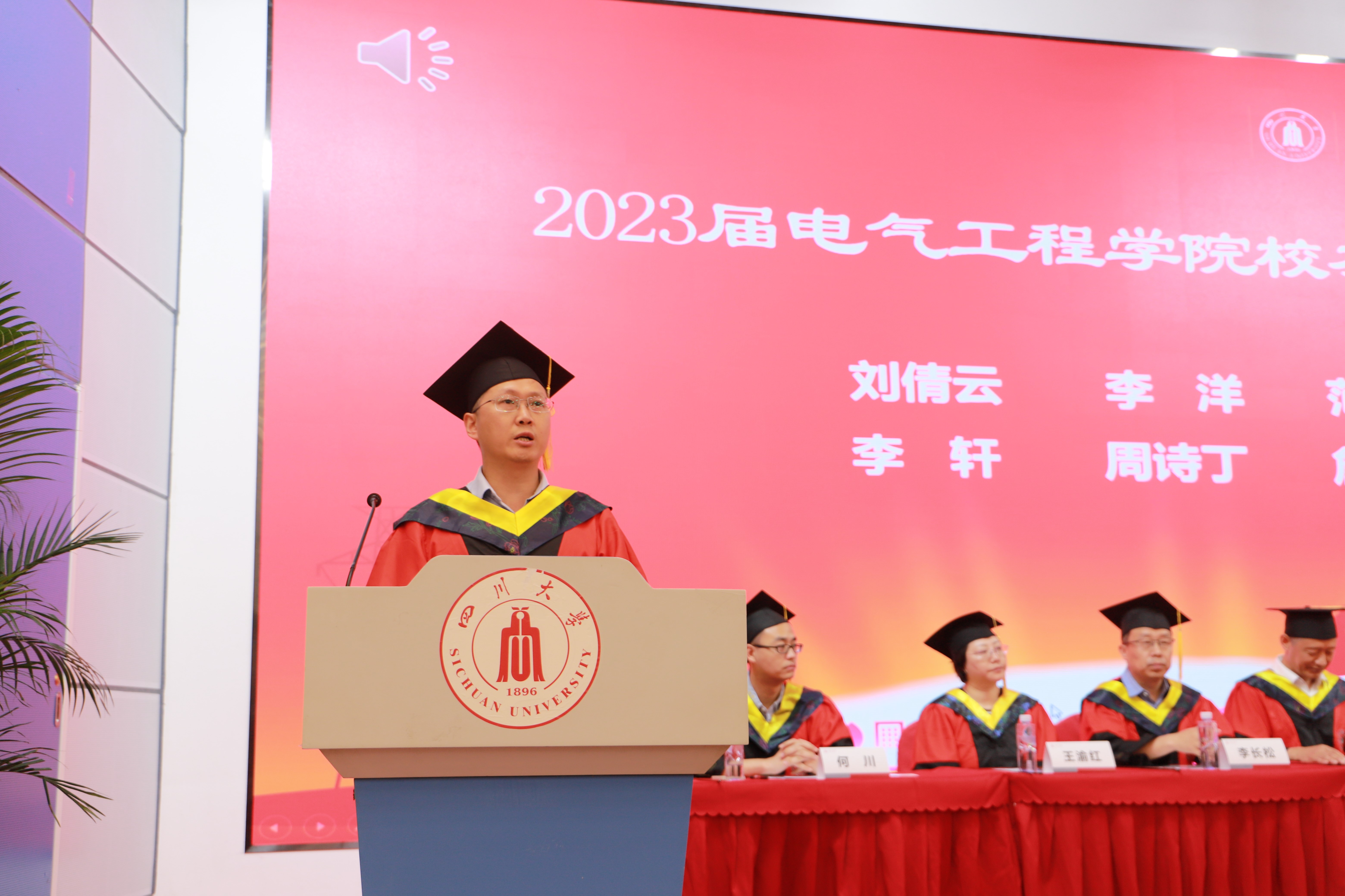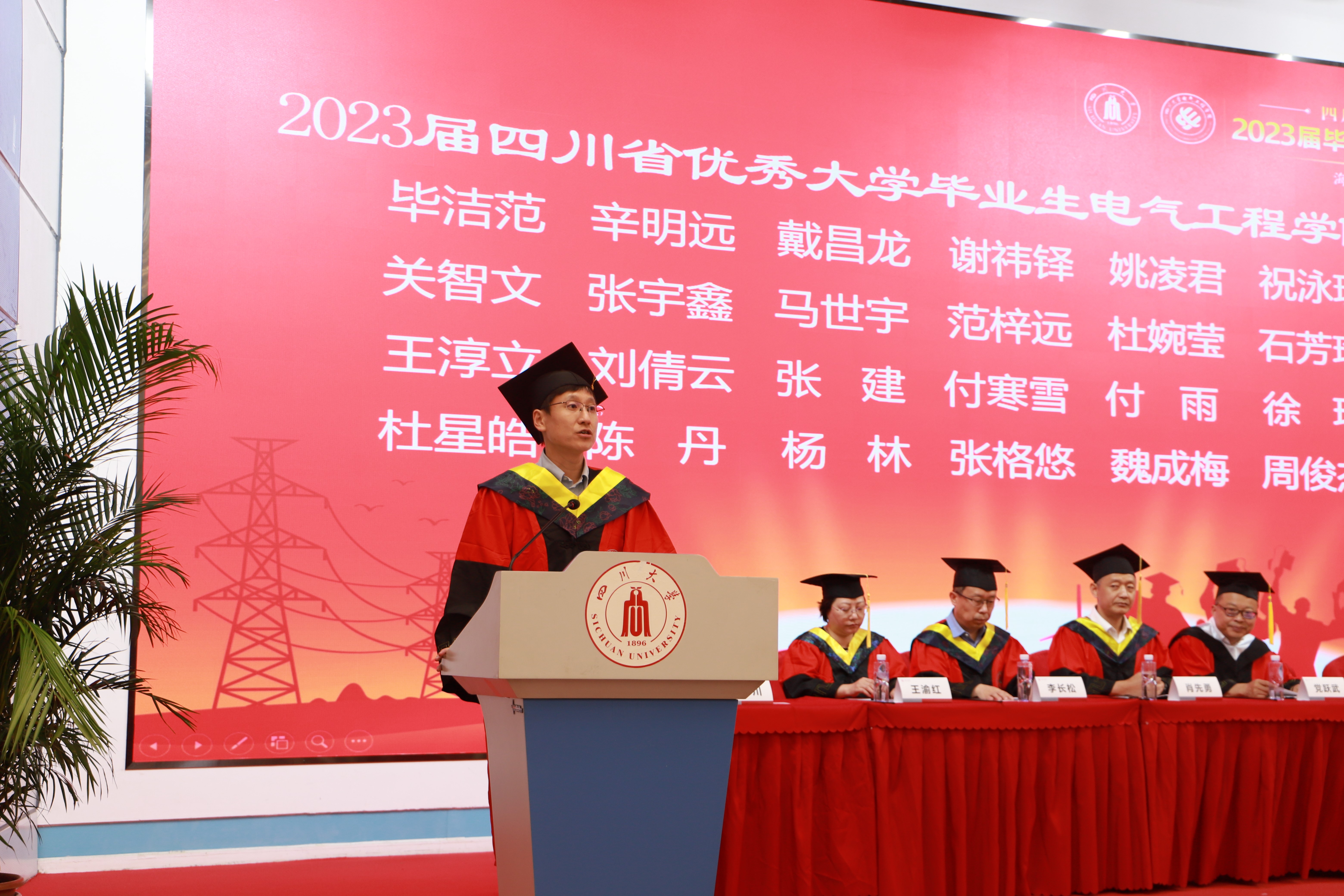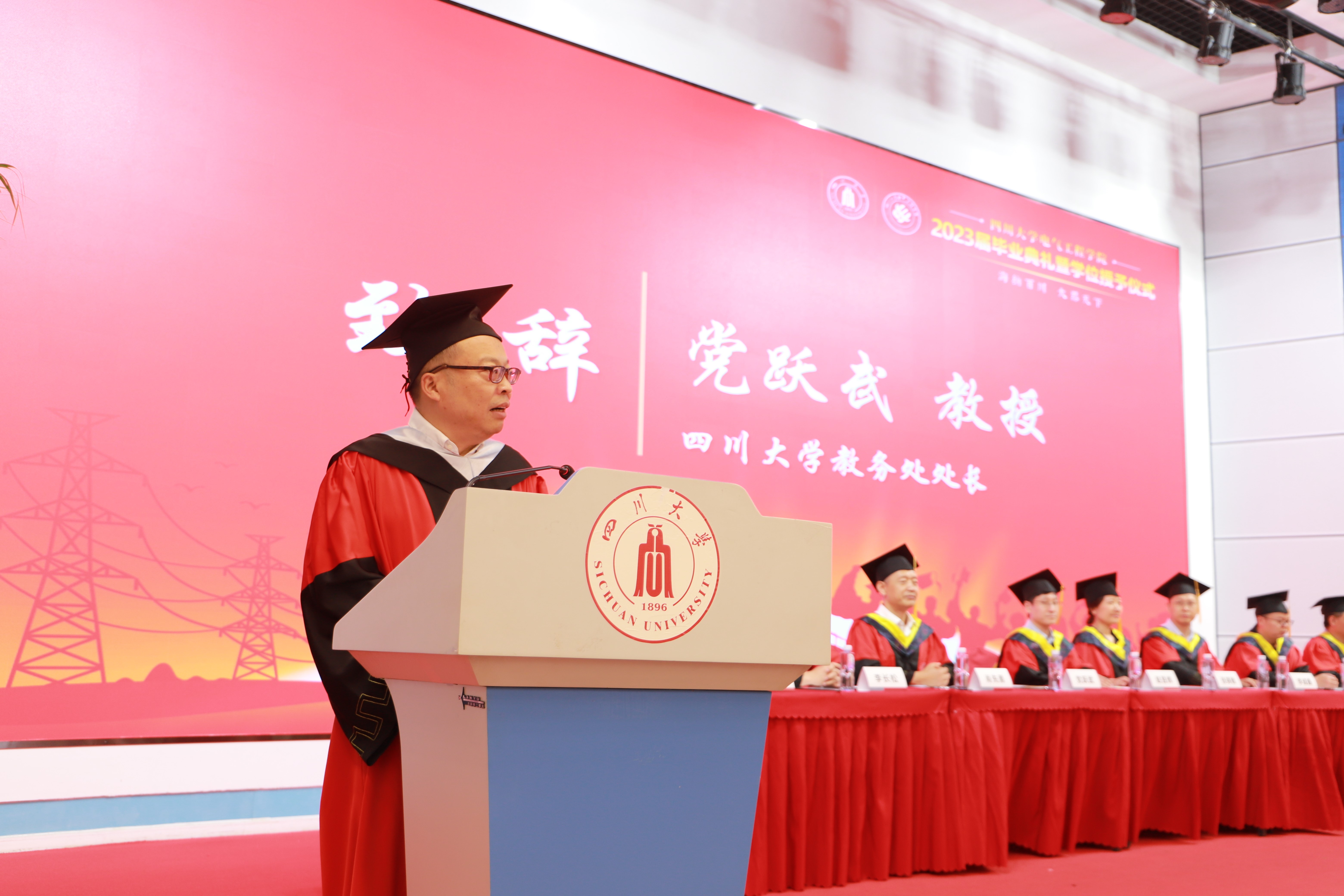 学校教务处处长党跃武发表致辞。他首先向2023届英国上市公司365的全体毕业生顺利完成学业、走上新的人生征程表示祝贺。他以川大老校长任鸿隽先生1937年毕业典礼训词中“忠于所学”“有所不为”“继续求学”三句话来勉励同学。他说,忠于所学就是要有心怀国之大者的光荣使命,有所不为就是要有以人民为中心的价值准则,继续求学就是要有把本领学到手的成才境界。他希望每位电气毕业生都要把川大的精神带出去,把川大的味道留身上,奔向五湖四海,融入星辰大海。在新时代的新征程上,一起努力奋进,一起爱党爱国爱川大,永远为伟大祖国雄起,永远为四川大学扎起,地负海涵,直挂云帆!