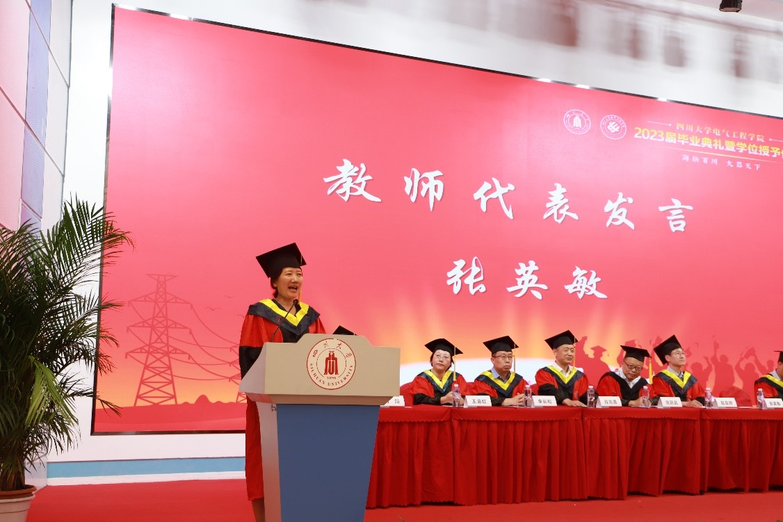 教师代表、张英敏副书记在发言中对毕业生们顺利完成学业,即将迎来人生中新的重要起点表示祝贺。她用一首简短而寓意深刻的自创诗表达了对毕业生们的祝福与期望,她说,所有过往,皆为序章;心向未来,尽可期望,希望每位毕业生在未来的人生旅途中展现川大人的风范与担当,厚德载物、自强不息,砥砺前行、不负青春!