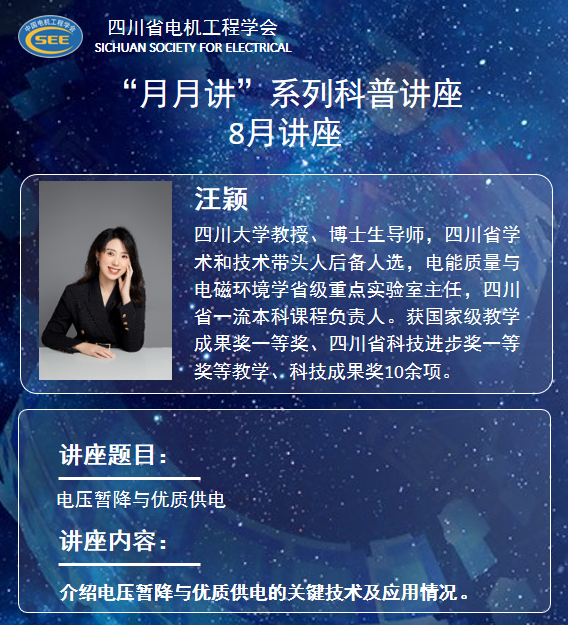 8月15日下午,我院汪颖教授受邀参加四川省电机工程学会主办的“走近电力”月月讲线上活动,并作题为“电压暂降与优质供电”的科普讲座。各高校及电网等企业的科技工作者共400余人观看了本次讲座。