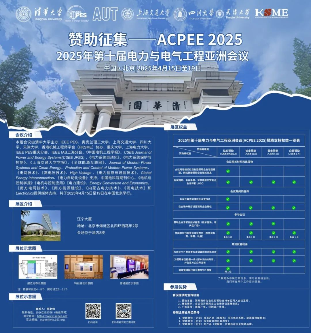 2025年第十届电力与电气工程亚洲会议(ACPEE 2025)将于2025年4月15日至19日在中国北京召开。会议是由清华大学主办, 四川大学牵头,IEEE PES、奥克兰理工大学、上海交通大学、天津大学、安徽理工大学、香港机械工程师学会(HKSME)、中国仿真学会综合能源系统数字孪生专委会共同协办,重庆大学、上海电力大学、IEEE PES重庆分会、IEEE IAS上海分会、《中国电机工程学报》、CSEE Journal of Power and Energy Systems (CSEE JPES) 、《电力系统自动化》《电力系统保护与控制》《上海交通大学学报》《全球能源互联网》、Journal of Modern Power Systems and Clean Energy、Protection and Control of Modern Power Systems、《电网技术》、《高电压技术》、High Voltage、《电力信息与通信技术》、Global Energy Interconnection、《电力自动化设备》支持,中国电科院期刊中心、《电机与控制学报》、《电力建设》、 Energy Conversion and Economics、《南方电网技术》《南方能源建设》《内蒙古电力技术》《发电技术》、Electronics、《山东电力技术》、AR电气和电池视界公众号提供媒体支持。会议主题“低碳时代电力系统的创新和先进技术”。