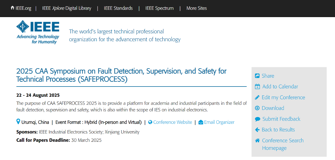 CAA SAFEPROCESS 2025已被列入IEEE会议列表!