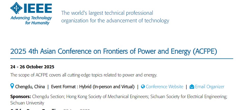 2025年第四届电力和能源前沿亚洲会议(ACFPE 2025) 将于2025年10月24日至26日在中国成都举行,会议由四川大学和四川省电机工程学会联合主办,IEEE 成都分会技术协办,香港机械工程师学会(HKSME)和《全球能源互联网》提供支持,《中国电机工程学报》、CSEE Journal of Power and Energy Systems (CSEE JPES) 、《电力系统自动化》、Journal of Modern Power Systems and Clean Energy、《电网技术》《新型电力系统》《高电压技术》、High Voltage、《电力工程技术》《电力信息与通信技术》《电气工程学报》《中国电气工程学报(英文)》《发电技术》《电机与控制应用》《四川电力技术》、electronics、《南方电网技术》《内蒙古电力技术》《南方能源建设》、AR电气和《智慧电力与能源安全(英文)》提供媒体支持。会议主题“人工智能赋能未来智能电网技术创新”。