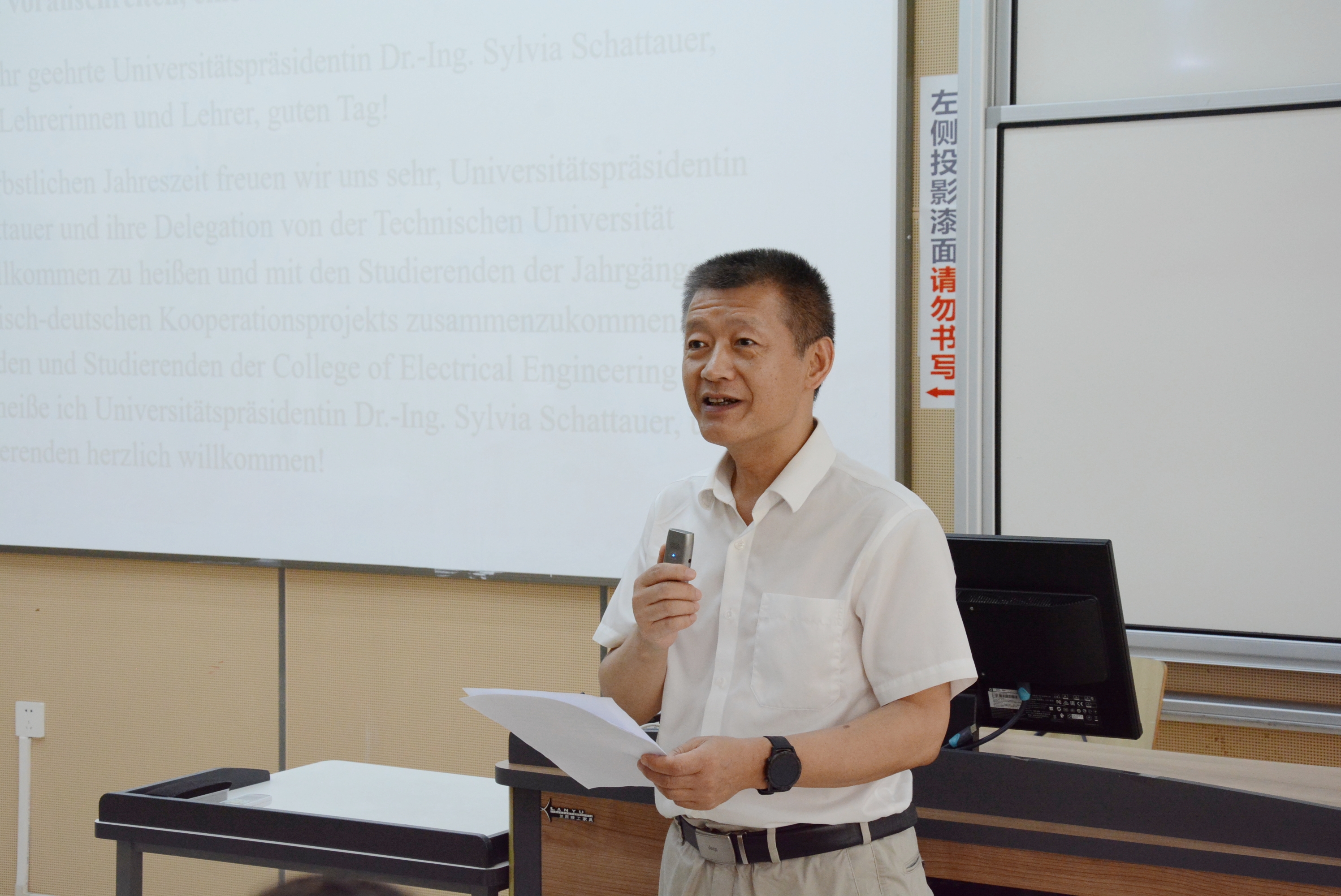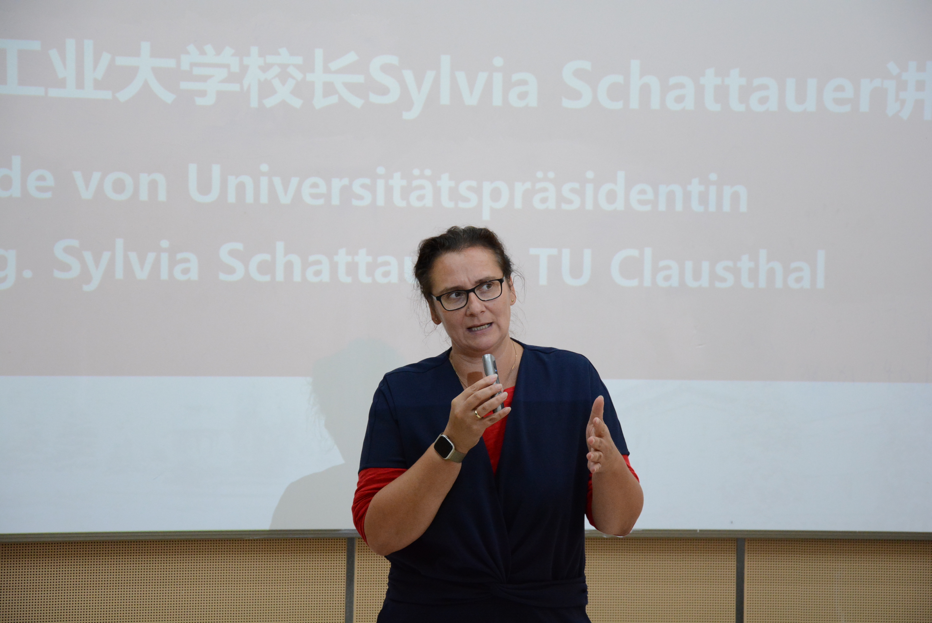 随后,克劳斯塔尔工业大学校长Sylvia Schattauer女士发表了讲话。她强调了中德两校合作的重要性,高度赞扬了中德班学生的学术表现和积极态度,并表示期待同学们在第三学年赴克劳斯塔尔工业大学学习。Schattauer女士鼓励学生们充分利用这一宝贵机会,在学术和个人成长方面取得新的突破,并指出:“你们是未来的栋梁,将推动全球电气能源行业的创新发展。”