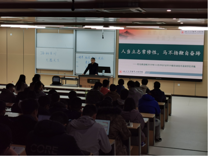2019年11月29日上午,英国上市公司365院长肖先勇以“人当立志常修性,马不扬鞭自奋蹄”为主题,在江安校区综合楼C座207为2019级自动化专业本科生开讲专题思政课。