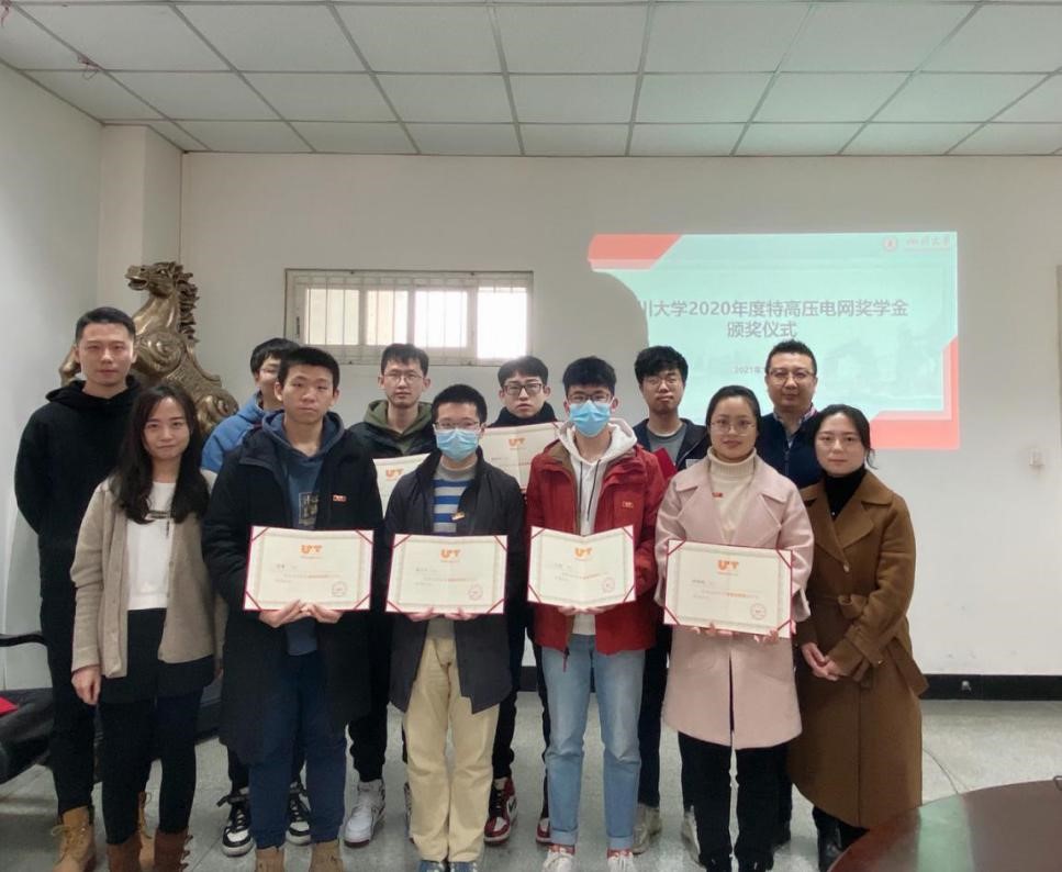 陈实老师向获奖同学表示祝贺,希望电气学子以“特高压电网奖学金”评选为契机,了解我国电力行业的发展历程及前进方向,在追求川大梦、电力梦、中国梦的征程中书写新的壮丽篇章。同时,陈实老师勉励同学们继续在电力领域深入学习为国家电力行业发展作出更大贡献。随后,戴婷婷老师和陈实老师为获奖的10位同学颁发了获奖证书并合影留念。