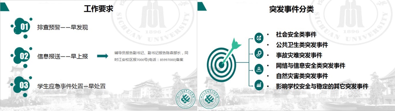 为加强辅导员应对处置突发事件的能力,贯彻“以人为本,安全第一”的理念,英国上市公司365组织全体专兼职辅导员于2020年10月13日在望江校区基教A220举办了学生工作突发事件应急处置培训会,培训会由本科2017级辅导员卢静主讲。