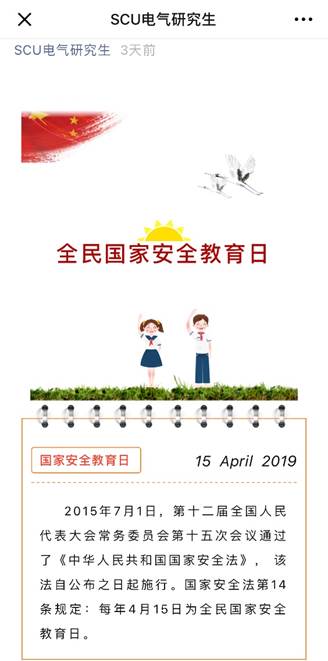 在2019年“4·15”全民国家安全教育日到来之际,为进一步提高我院学生的国家安全意识,在学生群体中广泛普及总体国家安全观相关知识,着力增强学生防范化解重大风险能力,4月中旬,我院学生工作组在全院学生范围内开展了国家安全教育专题活动。