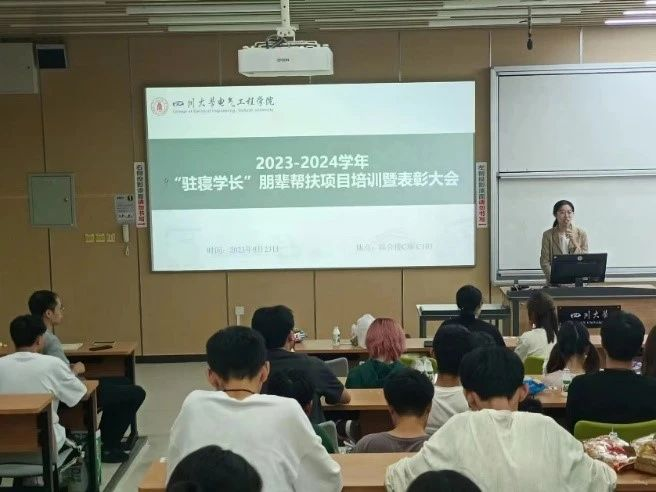 2023年9月23日晚, 2023-2024学年“驻寝学长”朋辈帮扶项目培训暨表彰大会在江安校区综合楼C座C103顺利开展。2021级本科生辅导员任杰老师担任主持,2023级本科生辅导员杨龙杰老师、2021级及2022级驻寝学长共50余人参加本次大会。