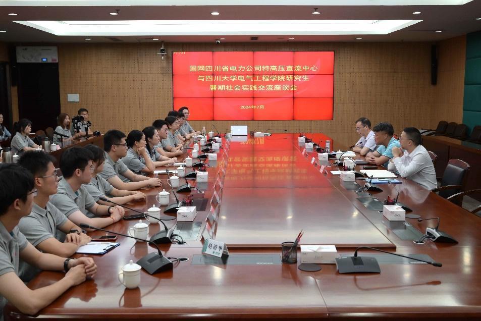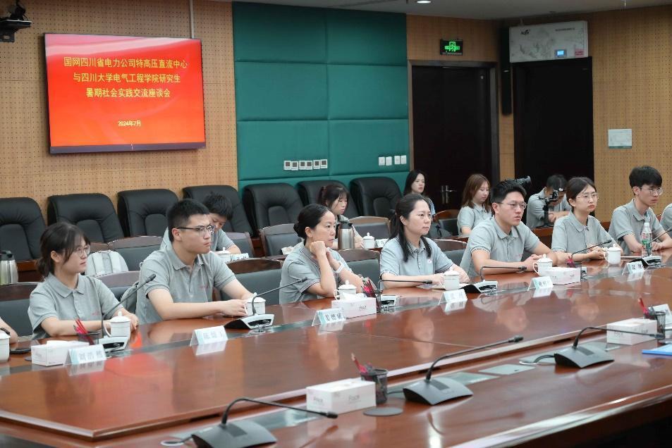 活动伊始,实践团一行同国网四川省电力公司特高压直流中心主任、党委副书记文曹以及直流中心相关负责人举行校企访谈交流座谈会。在座谈会上,文曹主任对直流中心的运营情况、技术实力、未来发展规划进行了详细介绍,并结合自身职业生涯分享了工作经验和职业生涯规划建议。随后,学院党委副书记戴婷婷就学生职业发展、院企合作现状、此次社会实践活动目的等进行了介绍,并对人才输送、院企合作等方面工作进行了交流。