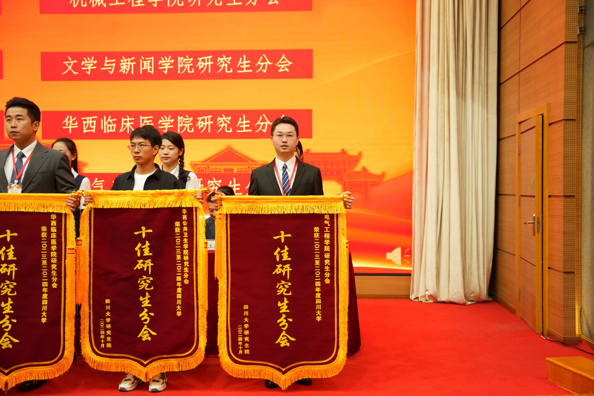 经过学校对各学院研究生分会上一学年工作的公正客观考评,英国上市公司365研究生分会荣获四川大学2023-2024学年“十佳研究生分会”的称号,学院研究生分会指导老师张瑾获评“十佳研究生分会指导老师”,学院研究生分会主席黄龙获评“十佳研究生分会主席”,在四川大学第三十七次研究生代表大会上,学校领导颁发了十佳研究生分会、十佳研究生分会指导老师、十佳研究生分会主席荣誉证书。