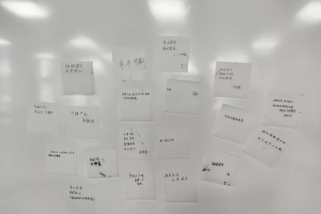 活动开始前,班级团支书卿朗宁引导同学们依次签到,并在“时光胶囊签到墙”KT板上写下对未来的期待与当下的思考。这些承载着心声的文字,既是献给未来的寄语,也为活动增添了一份温暖的仪式感。