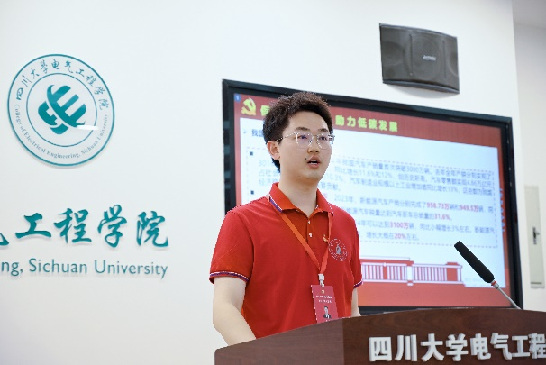 2022级硕士研究生黄龙作为集体负责人以“聚如火炬共求索,散作星辰映山河”为主题,在“十佳”学生集体评选答辩现场进行了精彩展示,从多个维度全面展现了党支部的成长历程与精神风貌,生动诠释了川大电气青年的责任担当与奋斗风采。