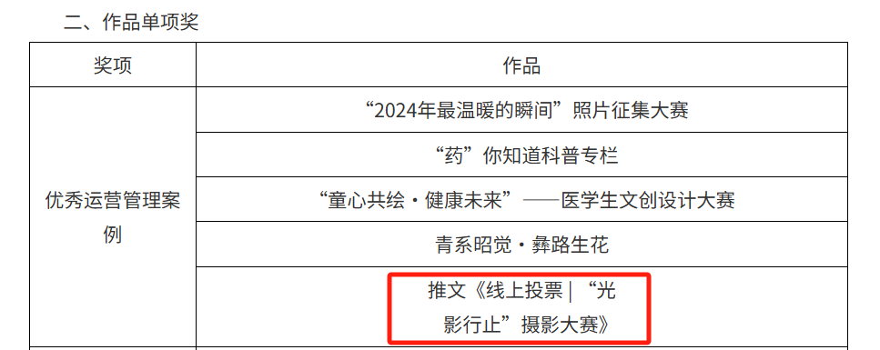 此外,由我院团学新媒体团队自主策划并运营的推文《线上投票|“光影行止”摄影大赛》,因出色的活动联动与传播效果,荣获“优秀运营管理案例”单项奖。