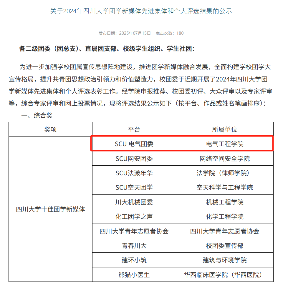 近日,校团委组织开展了2024年四川大学团学新媒体先进集体表彰工作。经全校各单位申报推荐、校团委初评、大众评审和专家评审等环节,综合专家评审意见及网上投票情况,我院“SCU电气团委”平台凭借精品内容打造与扎实的思想引领成效,获评2024年度“四川大学十佳团学新媒体”!