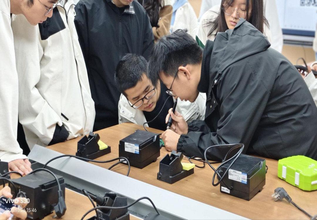 下午15:30,第一场活动开始。首先,科协叶生福部长为同学们介绍了该实验室的一些电子器件,并重点展示和介绍了电烙铁和数字示波器的用途与使用方法;接着他演示了贴片电阻的焊接,并邀请同学们亲自体验;最后他通过讲解实验室的使用规范和注意事项,让同学们对实验器材有了初步认识,掌握了简单的操作技巧。
