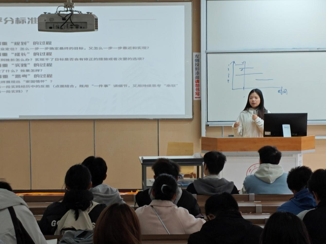 此外,讲座特别邀请了两位优秀同学前来分享实战经验。艺术学院的马清楠同学,作为第二届全国大学生职业规划大赛银奖获得者,以“国赛实战者”视角,拆解获奖作品的创作逻辑。马清楠同学不仅结合自身备赛的亲身经历,还参考众多金奖作品案例,讲解了如何精准确定职业目标、怎样通过实践高效积累素材,以及如何在作品中充分体现持续深入的思考。
