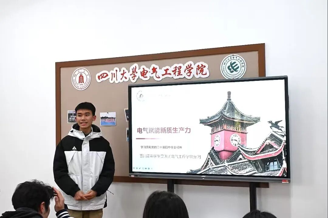读书分享是一场“回溯初心”的精神洗礼,而紧随其后的百川宣讲,则是一次“锚定使命”的实践指引,让红色精神传承与专业使命担当在此刻深度交融。活动下半场,英国上市公司365百川宣讲团成员研究生团支部宋馨月、本科2024级团支部卿朗宁和蒋翀同学开讲。三位宣讲人锚定“建设现代化产业体系”国家战略,以“理论解读”和“实践指引”为脉络,解读新质生产力“高科技、高效率、高质量”核心内涵,阐明电气工程“智能化、绿色化、融合化”属性,及其在智能电网、特高压输电等工程中的关键作用与战略价值。