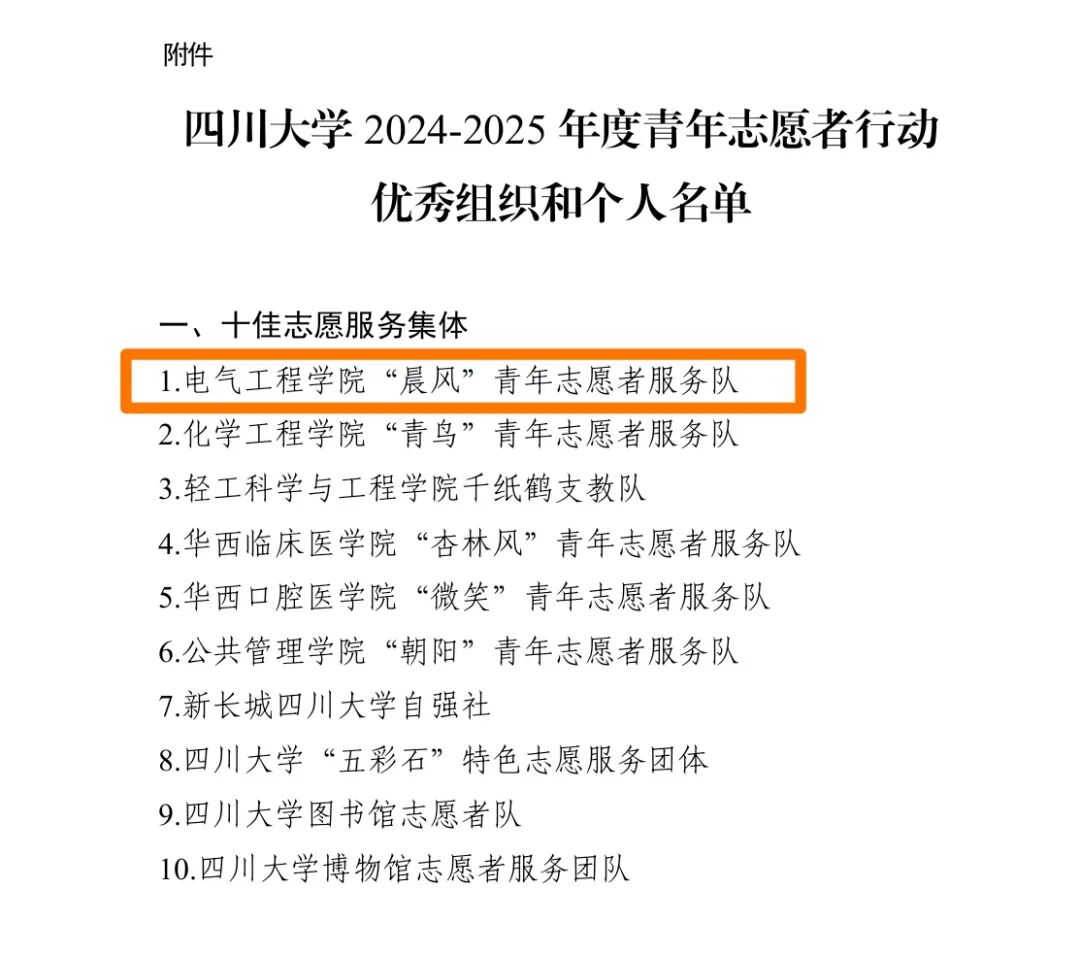 经各单位自主申报、相关单位和各学院评选推荐、评审专家和各学院学生代表进行综合评审,我院“晨风”青年志愿者服务队凭借扎实的服务成效脱颖而出,获评四川大学2024-2025年度“十佳志愿服务集体”!