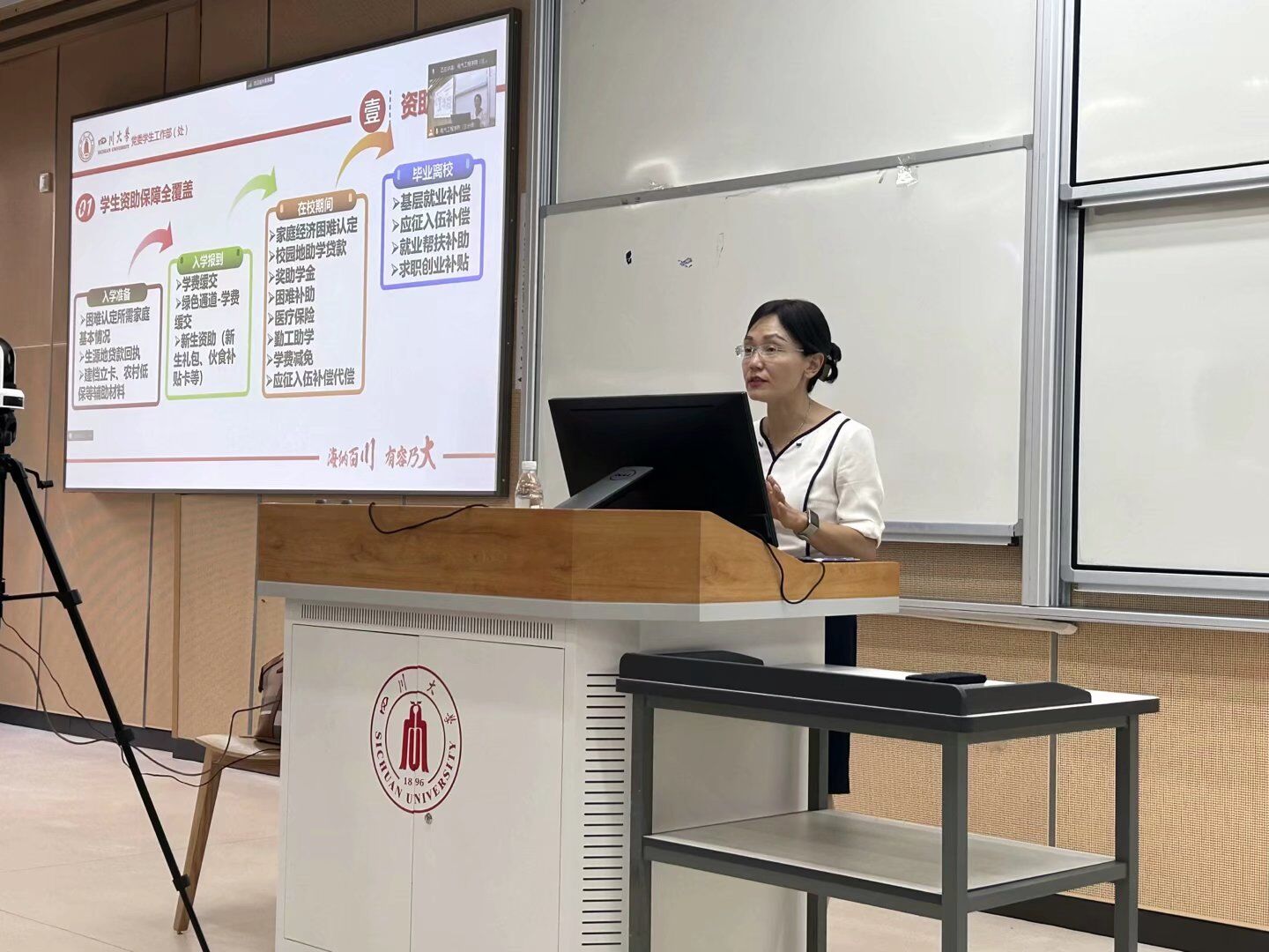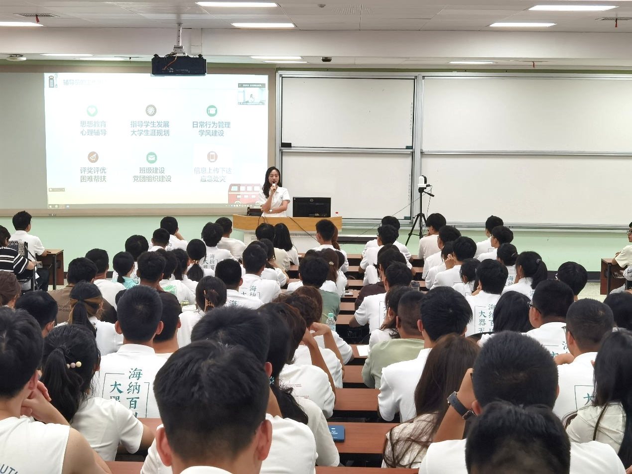 9月13日下午,学院邀请学工部资助中心卓玛老师担任主讲嘉宾,向新生们宣讲学校的资助政策。卓玛老师深入、细致地介绍了由国家、社会和学校共同建立的八位一体资助育人体系,切实全方位为每位川大学子顺利完成学业保驾护航。卓玛老师还介绍了育人政策,包括四个成才计划,三个工作坊,以及“4+3”学生团队,帮助同学们提升综合能力。最后,卓玛老师提醒同学们警惕电信诈骗,远离校园贷款,提高防范意识和自我保护能力。