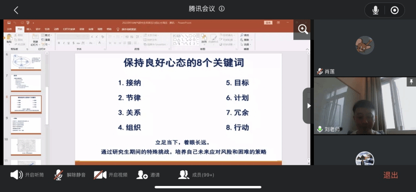 与心相约,健康前行。刘老师带来的这一场研究生心理健康精彩讲座得到了全体参会师生的一致好评,为新生季的开学教育提供了耐人寻味的心理一课!讲座不仅有专业的理论知识指导支持,也列举了很多发生在校园研究生同学当中的真实案例,真情真切,娓娓道来,打动人心且颇具启发性。