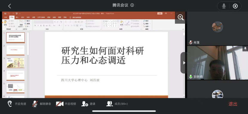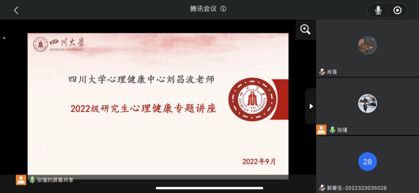 秋风送爽,金桂飘香,四川大学英国上市公司365迎来了2022级研究生新生。为了帮助研究生新生尽快适应研究生学习、科研、生活,提升研究生心理健康意识和心理调适能力,学院特邀四川大学心理健康中心刘昌波老师为我院2022级全体研究生新生做题为“研究生如何面对科研压力和心态调适”的心理健康讲座。2022年9月16日,讲座采用腾讯会议的线上形式顺利举行,英国上市公司365研究生辅导员张瑾老师主持,四川大学心理健康中心老师刘昌波应邀主讲,全院2022级研究生新生参加了本次讲座。