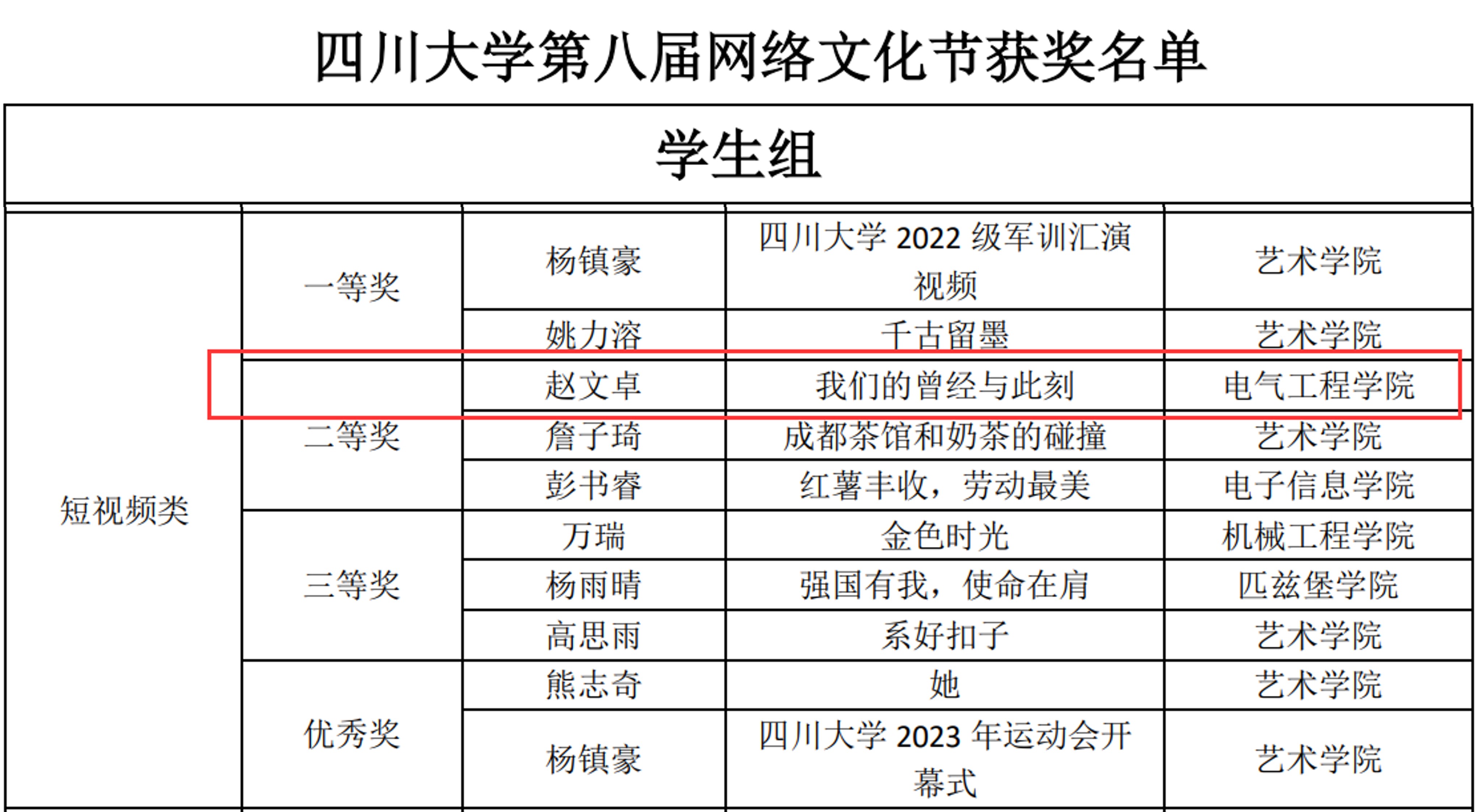 为引导全校师生深入学习贯彻习近平新时代中国特色社会主义思想,推动“时代新人铸魂工程”落地落实,奋力答好建设教育强国的川大答卷,学校党委宣传部开展了“习近平总书记与大学生在一起”新媒体原创作品大赛暨第八届网络文化节征集活动。我院本科生赵文卓制作的微视频作品获校级二等奖。
