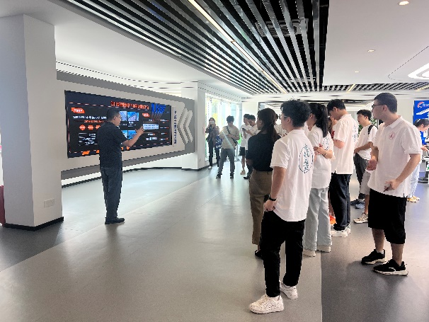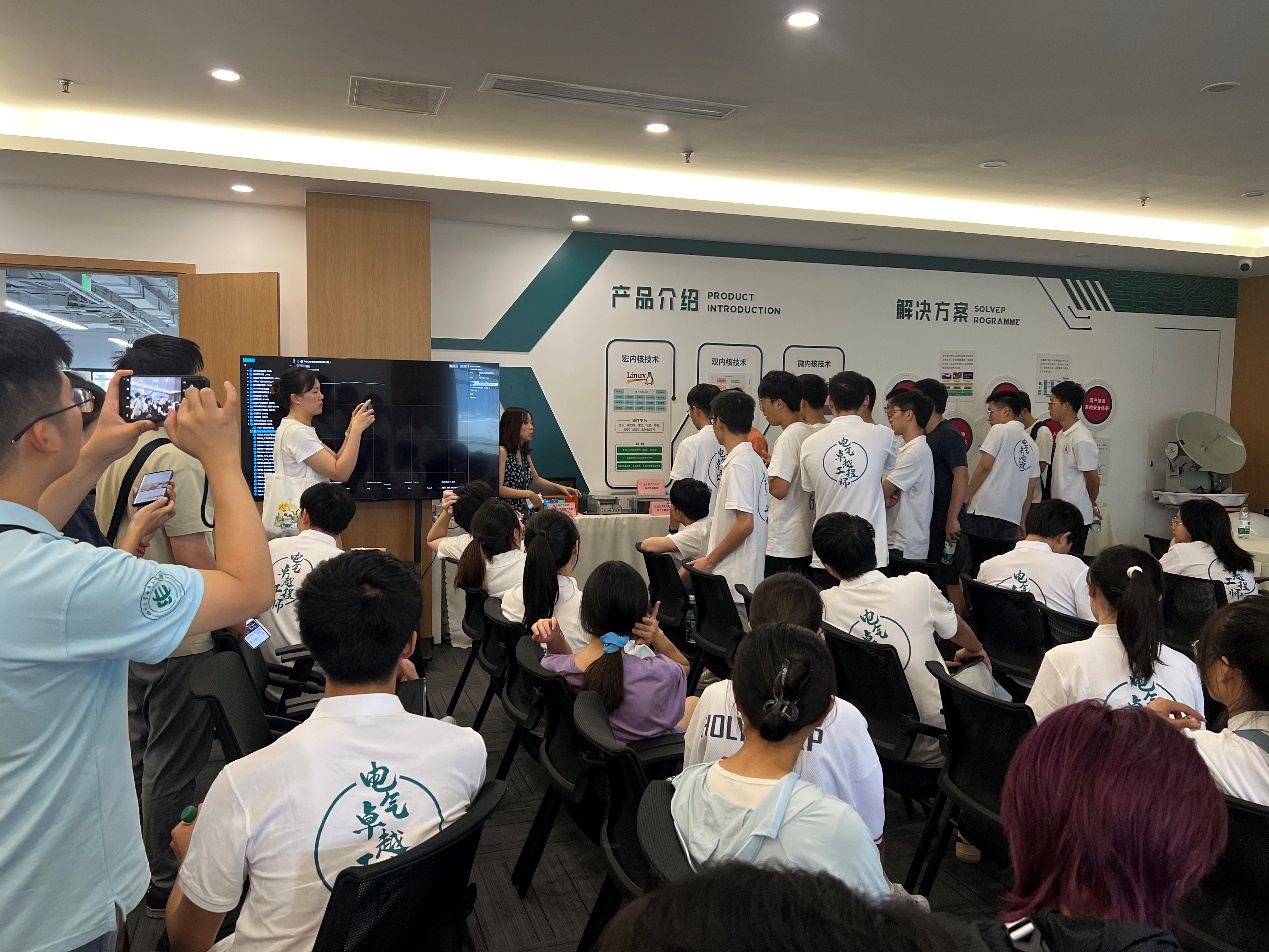 本次实践活动的第二站是菁蓉联创。在参观交流的过程中同学们了解到,菁蓉联创是一家以国产化基础软硬件定制开发为核心技术,主要从事国产基础软硬件产品设计、研发、生产和销售的高科技企业。面对“缺芯少魂”的难题,菁蓉联创秉持着“一个绿色系统点燃一颗芯”的理念,推出一系列如卫星健康监控系统、离线大模型RAG、国产芯片融合终端等国产化产品。在专家们讲解的过程中,同学们积极向专家们提问请教,对嵌入式系统与芯片驱动方面有了更深刻的认识。