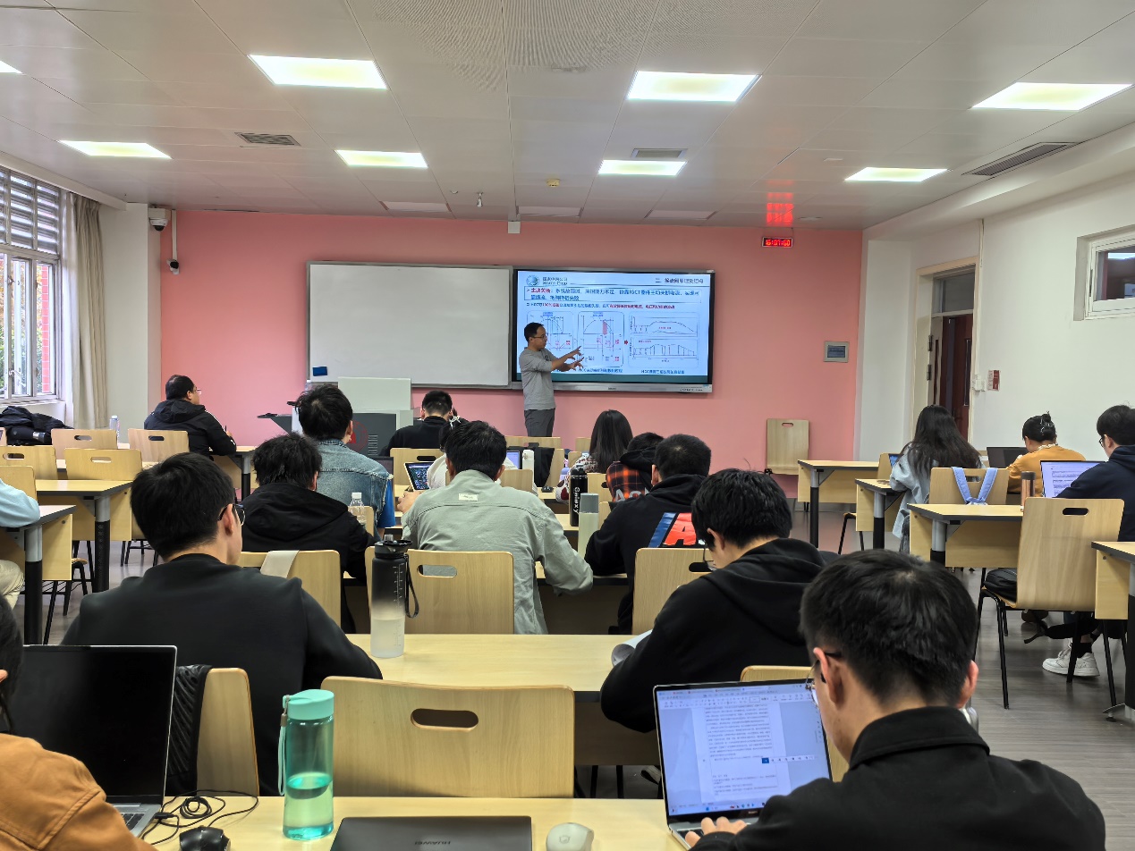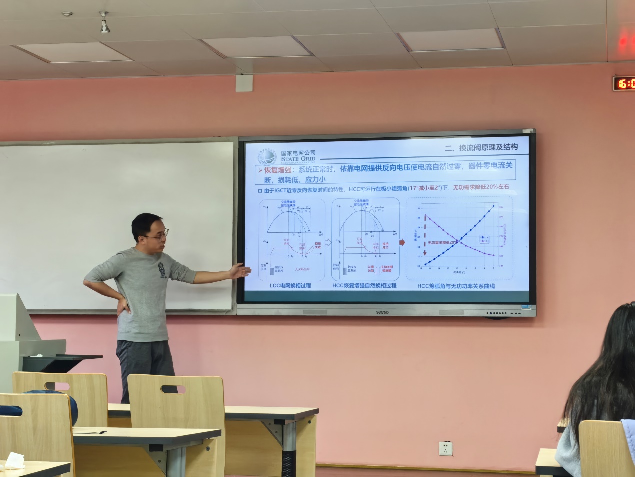 黄老师将内容划分为四部分进行讲解,涵盖直流输电技术概述、换流阀原理及结构、晶闸管阀典型故障分析、课程总结。黄老师结合自身工作经历及对特高压输电工程的理解,生动阐述了相关内容。通过结合具体工程实际问题,黄老师引领同学们认识了直流输电核心设备的工作原理与协同机制,并对市场现有技术和产品进行了中外技术对比。尤为重要的是,黄老师着重阐述了柔性直流输电换流阀的控制流程,强调在未来研究与工程应用中需将设备可靠性置于首位,使研究内容与具体工程实际相结合,为解决复杂工程实际问题奠定基础。
