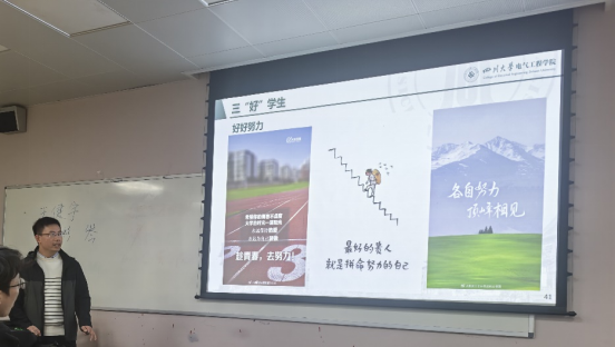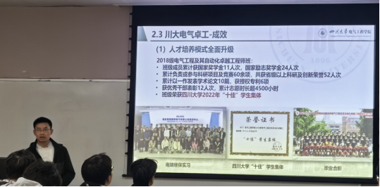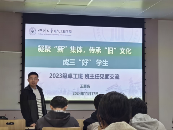 班会伊始,王老师带领同学们回顾了自己从2006年考入西南交通大学本科到2017年作为丹麦奥尔堡大学访问学者的求学生涯,并重点介绍了入职四川大学英国上市公司365后的科研团队和研究方向,增加了同学们对班主任以及本专业的了解。同时,王老师还介绍了自己曾经所带班级的光辉历史,鼓励新的2023级卓工班的同学们可以传承“旧”文化,争做先进集体。