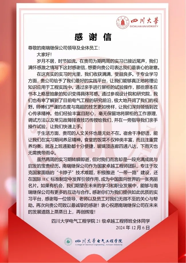 为期两周的实习不仅是一次实践能力的提升,更是一次对电气领域工程实践深刻理解的过程。通过这次实习,卓工班同学们不仅收获了宝贵的专业知识和实操经验,也深化了对行业的热爱与敬畏。此次实习进一步加深了四川大学英国上市公司365与南瑞继保的校企合作,期待未来双方能够在更多领域展开更加广泛的合作与交流。