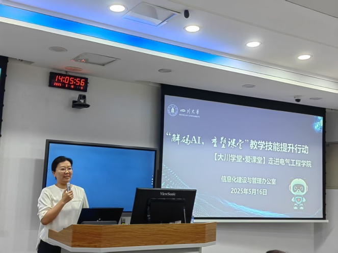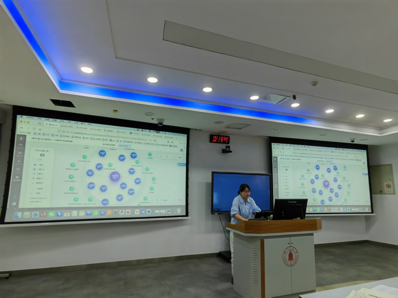 随后,会议进入主题分享环节。学校信息化建设与管理办公室的王春艳老师和田建林老师首先详细介绍了四川大学智慧教育平台“大川学堂·爱课堂”的基本功能与应用,以及课程智能体的建设。她们通过生动的案例和实操演示,展示了该平台在课前备课、课中互动、课后学情分析等方面的便捷性和高效性,让教师们深刻感受到了AI技术在课程教学中带来的全新教学思维和教学模式。