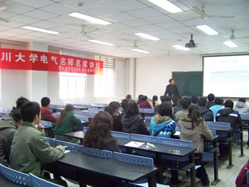 2015年9月11日早上9点30分,四川大学电气信息学院电气工程及其自动化专业2012级卓越工程师班成都振中电气实习总结会在望江校区基础教学楼B座104成功举办。出席本次总结会的嘉宾有电气信息学院副院长雷勇教授、电气工程系主任滕欢老师、电气工程系书记及卓工班班主任赵莉华老师、专业中心段述江老师、吴坚老师和辅导员何郁嵩老师。老师们的到场受到了同学们的热烈欢迎,同学们纷纷对老师们的关心照顾表示感谢。