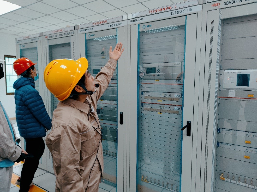 随后,主讲人带领同学们依次参观了厂站“心脏”主变压器,控制室等核心设备,并为同学们介绍包含变压器保护柜、测控柜、变压器三相避雷器等专业知识,同时也提到该变电站创新性的“五防解锁”。