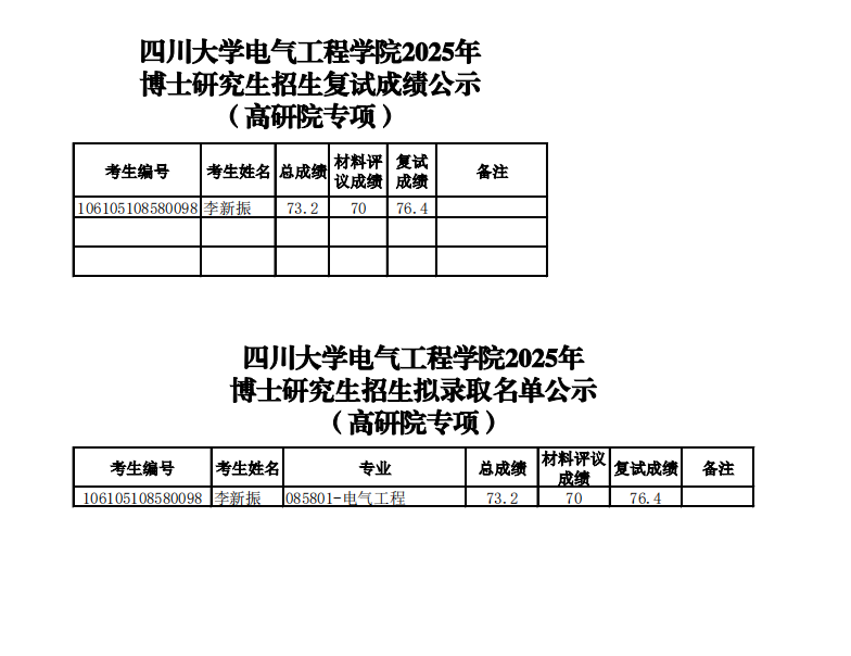 四川大学英国上市公司3652025年高等研究院专项计划博士研究生招生复试成绩、拟录取公示