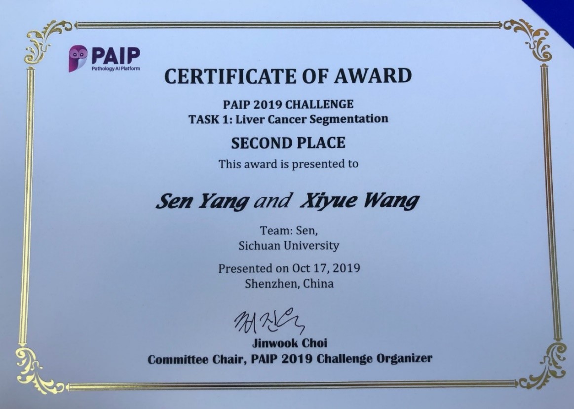 10月13日至17日,国际顶级医学影像学术会议MICCAI 2019在深圳举行。在MICCAI 2019肝癌病理图像分割国际挑战赛中,在我院自动化系张劲老师和腾讯AI医疗中心专家研究员韩骁老师的指导下,我院硕士研究生杨森和王熙月组成的团队编写的人工智能算法,荣获 MICCAI PAIP 2019 Challenge:Liver Cancer Segmentation 第二名。