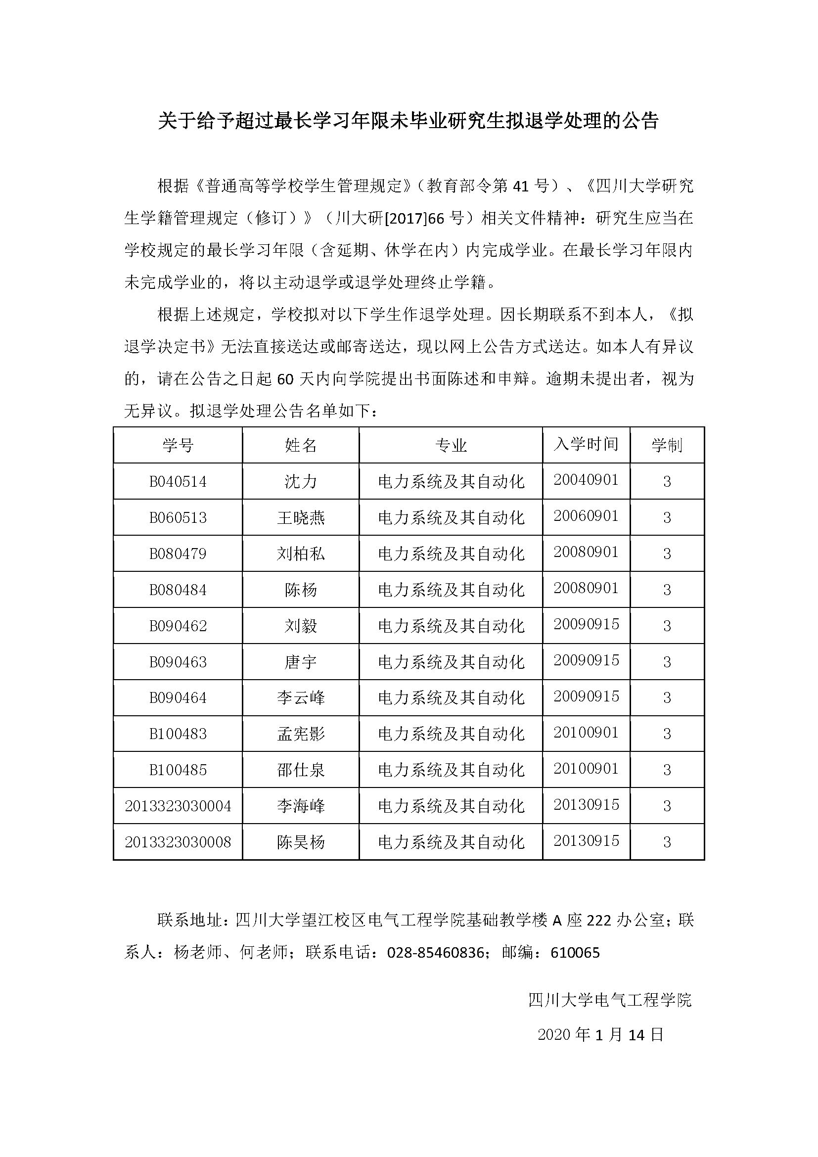 关于给予超过最长学习年限未毕业研究生拟退学处理的公告