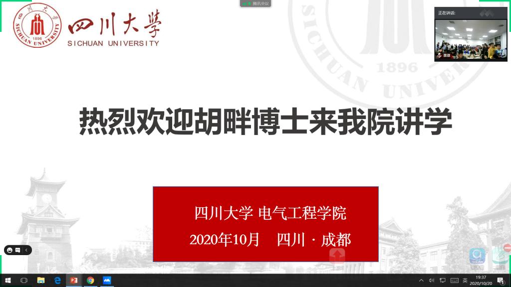 《电压暂降与短时电压中断》课程由英国上市公司365院长肖先勇教授以及所在团队的优秀青年教师汪颖副教授执教,已获准四川大学2020年研究生教改项目——高水平国际化项目立项。为了让课堂教学紧跟学术前沿,拓宽学生学术视野,丰富教育教学形式,10月20日晚上八点,国网湖北省电力有限公司电力科学研究院胡畔博士应邀进行授课,开展了题为“电压暂降及防治关键技术”的学术讲座。本次课堂以线上讲座+线下讨论的形式进行,学院众多硕博士研究生认真听取本次讲座,热烈讨论。本次讲座由汪颖老师主持。