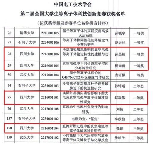 “先进绝缘技术与智能设备”研究团队黄小龙副教授、宁文军副研究员指导本科生孙昊楠、陈飞帆、范巧宇完成的项目“考虑阳极熔池影响的真空电弧等离子体输运特性的建模与仿真”获得一等奖,指导研究生孙韬、邬志云、赵婧冰完成的项目“直流开断过程中的真空电弧等离子体输运特性研究”获得三等奖;黄小龙副教授、任俊文副研究员指导研究生杨尚雨、冀一玮、唐萱完成的项目“真空电弧中不同价态粒子空间分布特性研究”获得一等奖,指导本科生赵双伟、牛滟葶、何泽锋完成的项目“实际外部横向磁场影响下的大电流真空电弧等离子体偏移特性研究”获得二等奖。四川大学作为参赛大学之一获得优秀组织奖。
