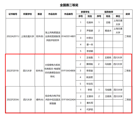 四川大学共有13支参赛团队参赛,其中6支队伍进入复赛,4支队伍进入决赛。我院王俊磊等同学的 “大规模电力系统机电暂态-电磁暂态仿真模型自动转化”项目和李明等同学的“结合电力电子技术的中低压直流断路器”项目获全国二等奖,陈茂林等同学的“兼具低成本、大功率、高制氢效率的新型整流器混合拓扑及控制策略”项目获全国三等奖。我院“电力系统稳定与高压直流输电”研究团队王顺亮副教授、马俊鹏副教授获优秀指导教师奖。
