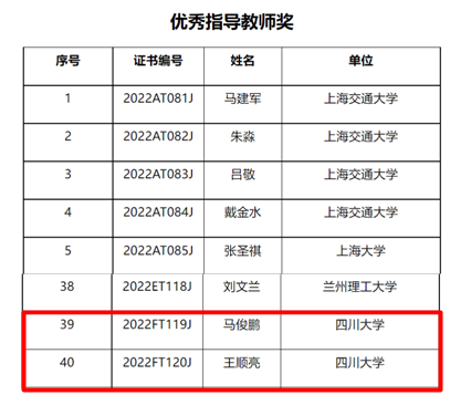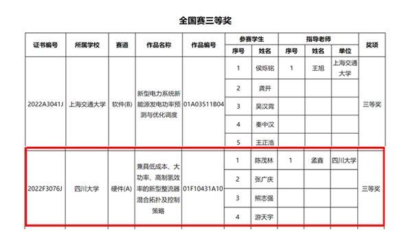 2022年9月20日,中国电工技术学会公布了第一届高校电气电子工程创新大赛全国赛获奖名单,我院学子荣获全国二等奖2项、全国三等奖1项、赛区一等奖2项及2位优秀指导教师奖的佳绩。四川大学获得“优秀组织奖”。