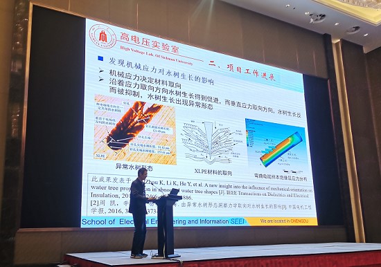 9月26号上午11点,周凯教授作为项目负责人在大宴会厅对已结题面上项目《纳米复合填充物对水树的修复及其在多因子老化下的作用机理研究》进行分享,汇报了水树缺陷引起电缆本体老化并提出电缆绝缘水树修复的研究背景和立项目标,项目的修复后水树空洞的纳米复合填充物与基体的相互作用机理、基于纳米SiO2复合填充的水树修复技术等工作进展,介绍了出版专著、专利申请、人才培养、科研奖励等成果,最后讲述了自己的心得体会,与其他参会代表开展了研讨。