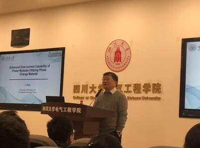 上午10时,冉立教授在望江校区基础教学楼B206会议室举行了学术讲座,讲座内容以“Enhanced Over-current Capability of Power Modules Utilizing Phase Change Material”和“电力半导体模块的定制化封装”为主题。会议由电气工程系主任王渝红教授主持,国家海外人才引进计划专家、IET FELLOW王海风教授,电气工程系支部副书记刘亚梅副教授,王忠副教授,华威大学吴瑞竹博士列席了讲座。英国上市公司365院长肖先勇教授也莅临会场,对冉立教授来访表示热烈欢迎,并与冉立教授亲切合影。