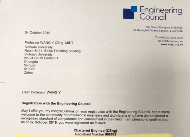 近日,我院电气工程系王渝红教授通过国际工程师资质认证,获颁英国皇家特许工程师证书。皇家工程师资格由英国工程理事会和英国工程技术学会联合认证,是世界公认的国际工程师资格认证之一。近年来引入我国,在中国科协工程能力评价和工程师资质国际互认工作的统一安排下开展。电气工程领域的认证从2018年10月开始,由中国电机工程学会(CSEE)和英国工程技术学会(IET)联合开展。通过认证的工程师将获得英国工程理事会、中国电机工程学会和英国工程技术学会联合颁发的证书,该证书受英国、欧盟、美国、加拿大、澳大利亚及亚太多个国家和地区认可。