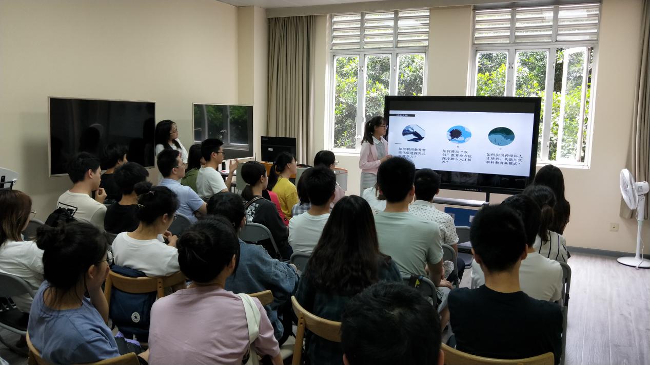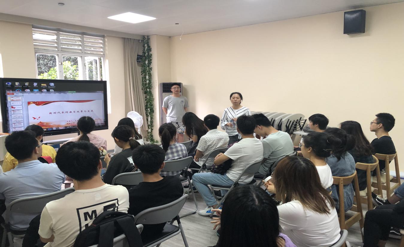支委会成员代表蒋兴玺,方梦秋同学分享小组讨论结果。蒋兴玺同学以本科教育的发展、本科教育改革的必要性、本科教育改革计划与最终方向带来展示。她表示“本科教育改革应当有四个回归,即‘回归常识、回归本分、回归初心、回归梦想’。”方梦秋同学则以五个“如何”引出主题,表示本科教育改革与发展应当“促进探究式学习”、“重视双创教育”“实现跨学科人才培养”等。